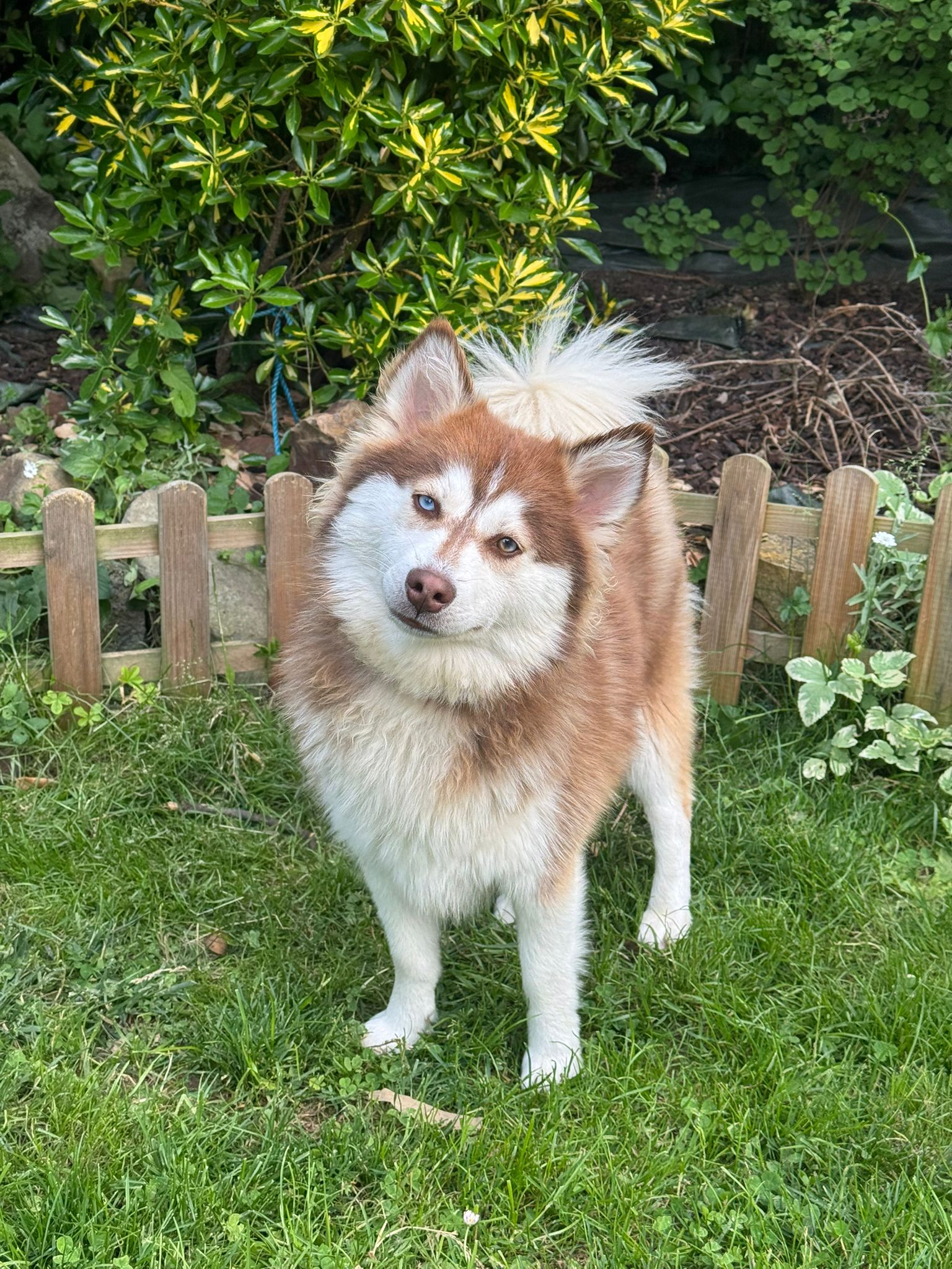 Pookie a été notre 1er mâle reproducteur ! Aujourd’hui, il coule des jours heureux chez une amis de l’élevage qui nous rend visite régulièrement. Il est le papa de 22 magnifiques bébés Pomskies nés chez nous.